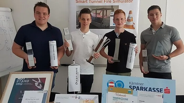 Patrick Krumpl, Christoph Ertl, David Petritsch und Nico Trinker von der HTL Mössingerstraße in Klagenfurt entwickelten einen Brandsimulator für Autobahntunnel. Für das Projekt erhielten sie HTL-Oscar.