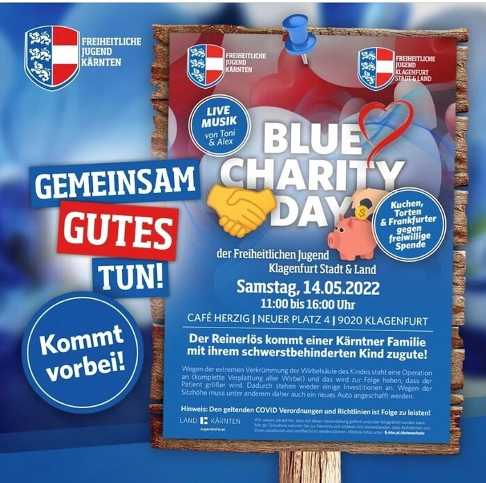 Am 14.5.2022 lädt die Freiheitliche Jugend Klagenfurt Stadt und Land zu einem Blue Charity Day in das Cafe Herzig, Neuer Platz 4 in Klagenfurt. Bei Livemusik von "Toni & Alex" können von 11 bis 16Uhr Kuchen, Torten und Frankfurter gegen eine freiwillige Spende konsumiert werden. Der Reinerlös daraus kommt "Kärntner in Not" zugute.