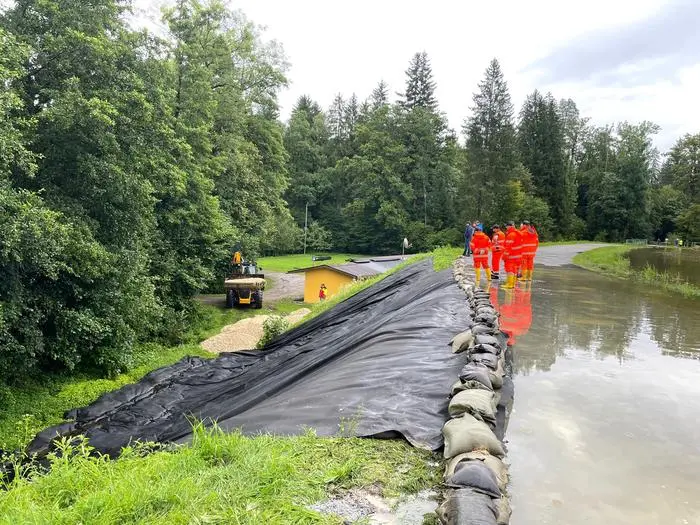 Der Treimischer Teich geht derzeit „kontrolliert über“, sagt Staubeckenverantwortlicher Franz Maidic. Die Feuerwehren schlichten in Viktring derzeit Sandsäcke, der Krisenstab berät zur Stunde, wie es weitergeht. Zwar geht der Teich kontrolliert über, „für Viktring ist es dennoch kritisch“, sagt der Verantwortliche.