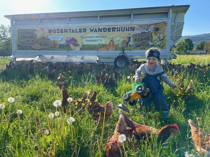 Markus Lapusch lebt in zwei Welten. Trifft man den 37-jährigen Banker nicht an seinem Arbeitsplatz, findet man ihn bestimmt auf seinem Achatzhof im Rosental. Eier und Kernöl stehen im Fokus des Familienbetriebs, in dem auch Sohn Noah fleißig mithilft.