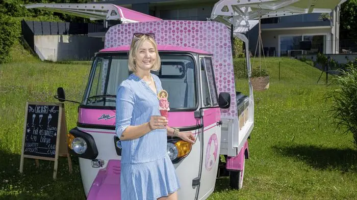 Seit zwei Jahren führt Lisa Wunder die fahrende „Eislisl“ in Pörtschach. Was einst mit einem kleinen Sommerjob begann, ist nun fester Bestandteil der lokalen Gastronomie-Szene am Wörthersee. Lokalitäten wie das „Seetrax“ oder die Ferienpension Wunder in Pörtschach verkaufen „Lisl“-Eiskreationen, auch in abgepackter Form. Seit Anfang des Monats ist die gelernte Köchin mit ihrem Piaggio-Eiswagen in ganz Kärnten unterwegs, neben zahlreichen Eissorten verkauft sie auch einen selbstkreierten Eisburger. Ihr Sortiment mischt sie täglich neu, Zitronenmelisse, Hollunder und co. gibt es für zwei Euro die Kugel zu kaufen. Passend zum Eiswagen sind auch die Eistüten pink eingefärbt, eine Mischung mit Roter Rübe verleiht die knallige Farbe.
