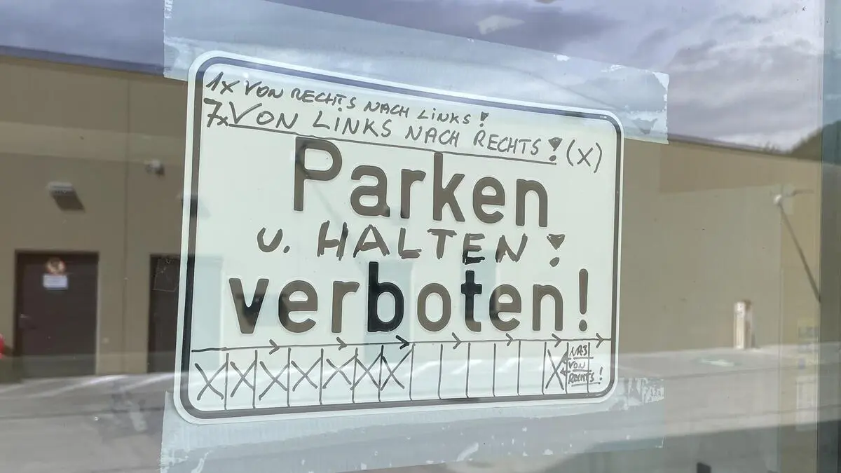 • Ein kleines, schwer sichtbares Schild weist auf das Parkverbot hin, was bereits von einem Rechtsanwalt kritisiert wurde.