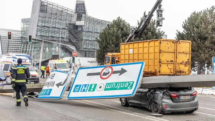 Ein Müll-Lkw des Magistrats rammte im Jänner mit ausgefahrenem Kran einen Überkopfwegweiser