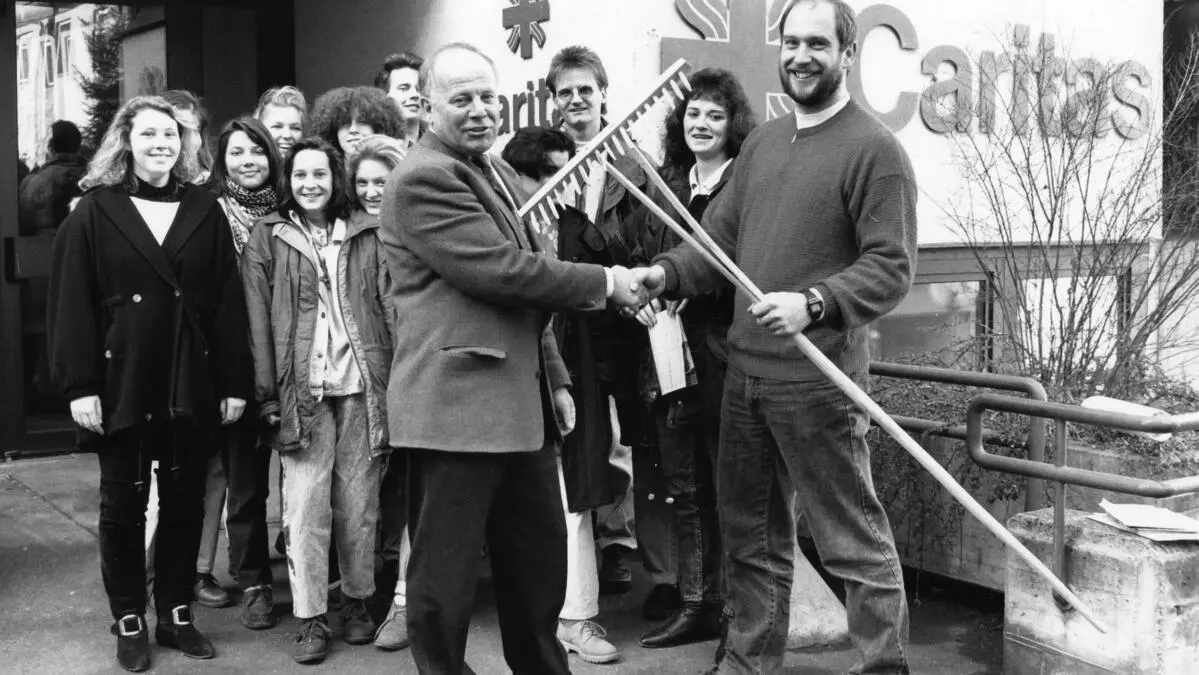 Lang ist es her: Der ehemalige SOB-Direktor Wilfried Hude (rechts) mit dem Caritas-Urgestein Peter Quendler und Schülerinnen bei der Übergabe des Rechens, als Symbol für das Zusammenkratzen von Spenden