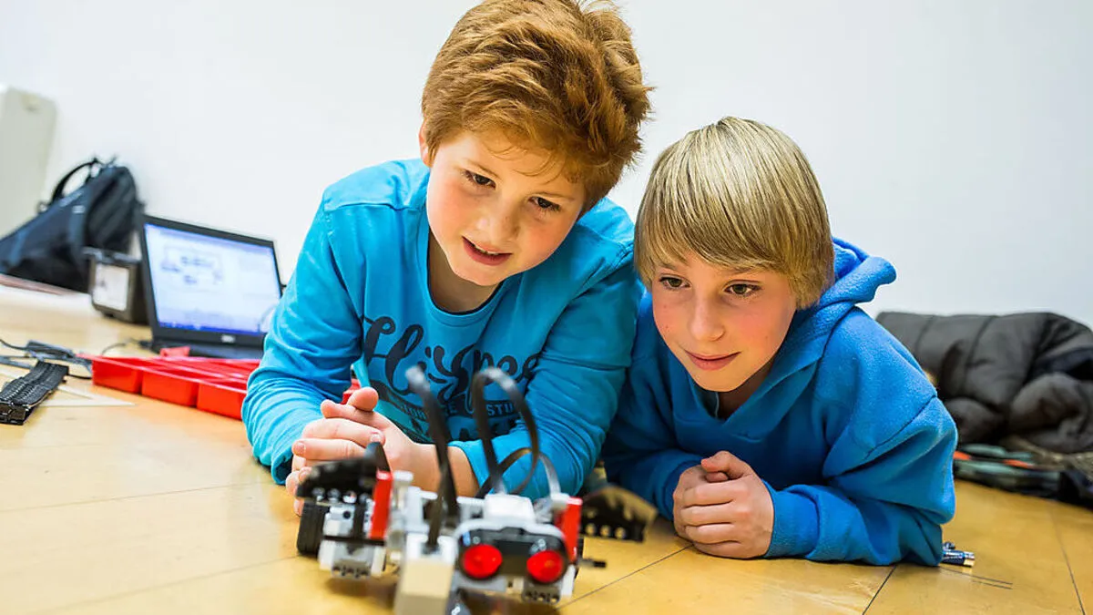 Tim (links) und Julian bastelten am vergangenen Freitag über drei Stunden an ihrem Roboter aus Lego