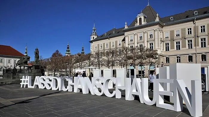 Riesen-Lettern vor dem Lindwurm und eine Reihe von Spiegeln sollen den Menschen die Augen öffnen: Die Initiatoren einer Psoriasis-Kampagne weisen damit auf Behandlungsmöglichkeiten hin.