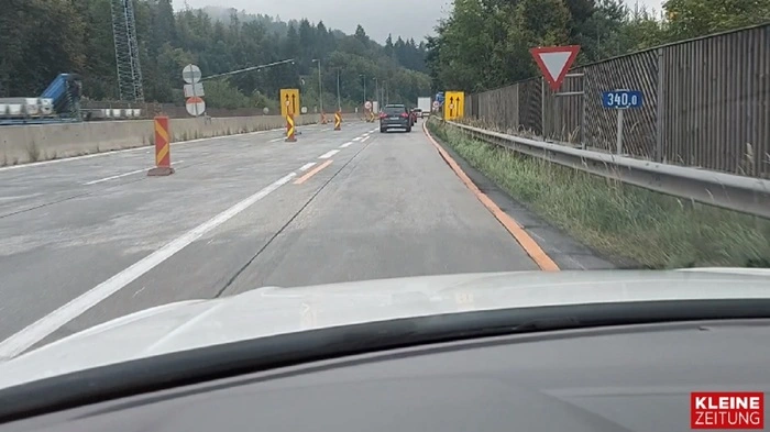 Seit Wochen behindert eine Baustelle auf der A2-Autobahn bei Techelsberg den Verkehrsfluß. Die zwei Fahrbahnen werden auf eine zwei Meter Fahrbahn zusammen geführt. Hier darf nur 60 Kilometer pro Stunde gefahren werden.