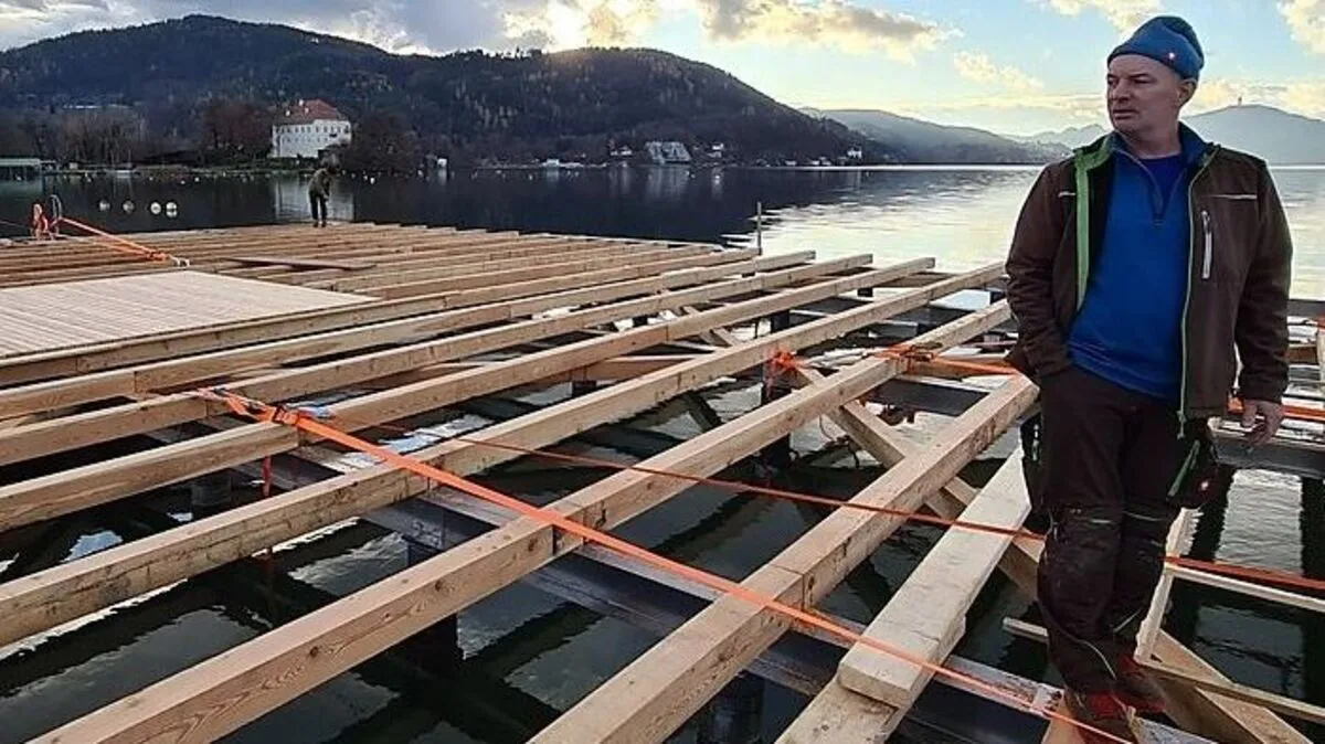 An die 2000 Quadratmeter Holz werden bis zum Anfang der Badesaison 2021 im Klagenfurter Strandbad verlegt. Die Firma Holzbau Gasser aus Ludmannsdorf arbeitet bei Wind und Wetter.