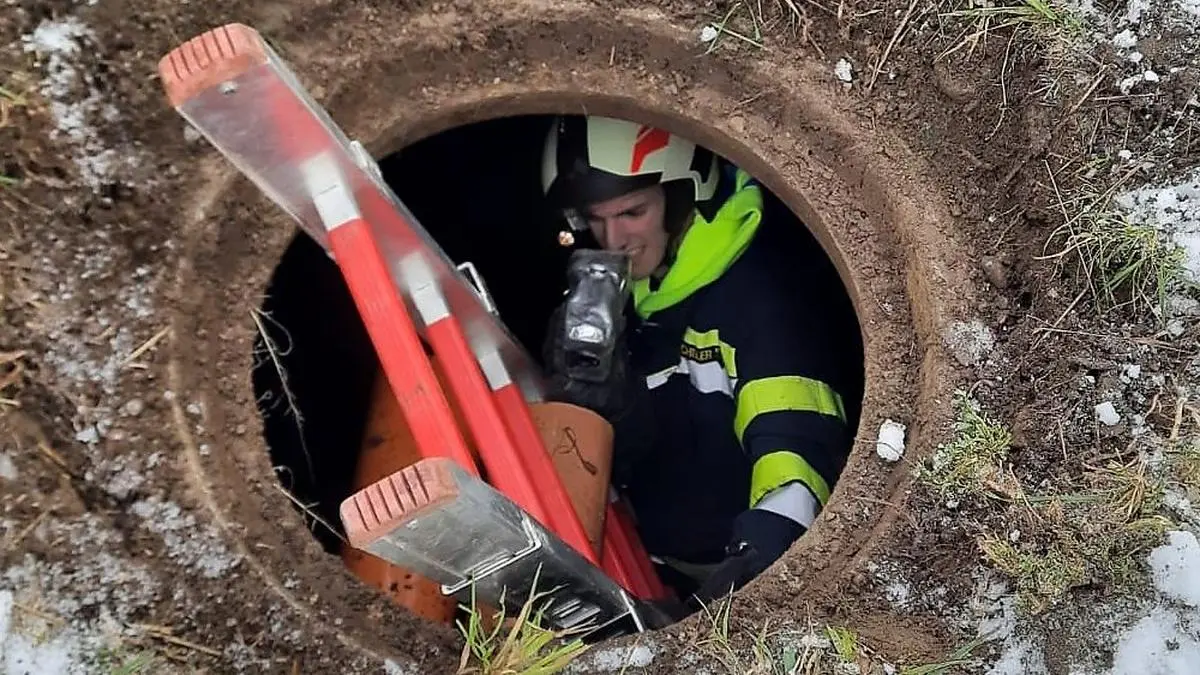Mit einem Abwasserschlauch wurde das geschwächte Tier in den Schacht geschoben, um es von dort zu bergen.