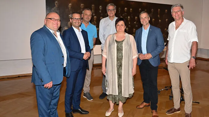 v.l.: Alexander Gerdanovits (Leiter der Abteilung Kultur), Kulturreferent Stadtrat Franz Petritz (SPÖ), Stadtrat Max Habenicht (ÖVP), Goran Djurović, Galerieleiterin Beatrix Obernosterer, Gemeinderat Michael Gussnig (TK) und Vizebürgermeister Alois Dolinar (TK)