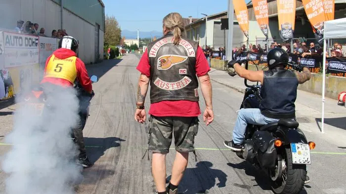 Ein Mann mit schwarzer Kutte mit dem Aufdruck „Hells Angels Austria“ steht zwischen zwei Motorradfahrer | Beim großen Jubiläumstreffen der Hells Angels im Kuss Wolfsberg ist keine Motorradparade vorgesehen
