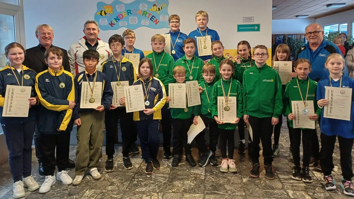 Kinder mit Urkunden und Medaillien; dahinter Erwachsene