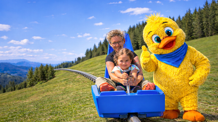 Eine Frau und ein Kind sitzen in einer Rodel, daneben steht ein gelbes Maskottchen in Menschengröße