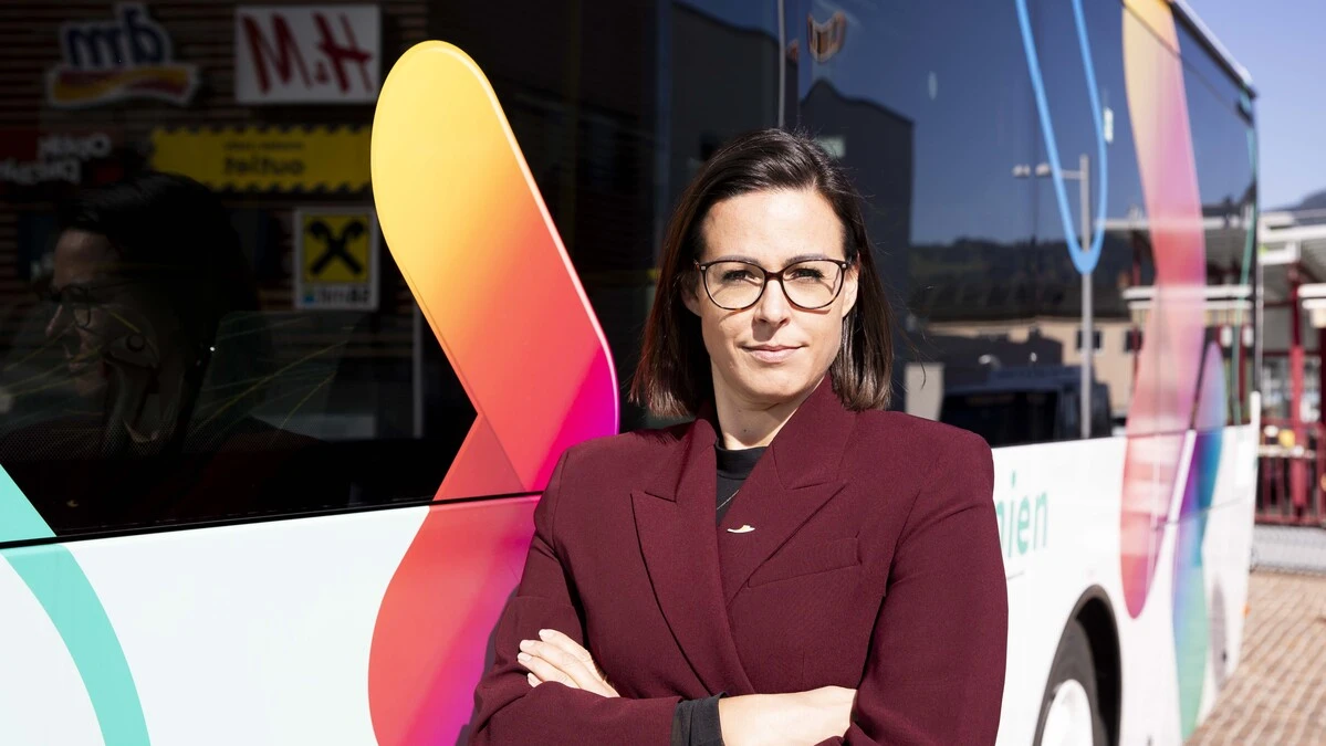 Beate Sommer steht in einem weinroten Blazer und verschränkten Armen neben einem Bus der Kärntner Linien