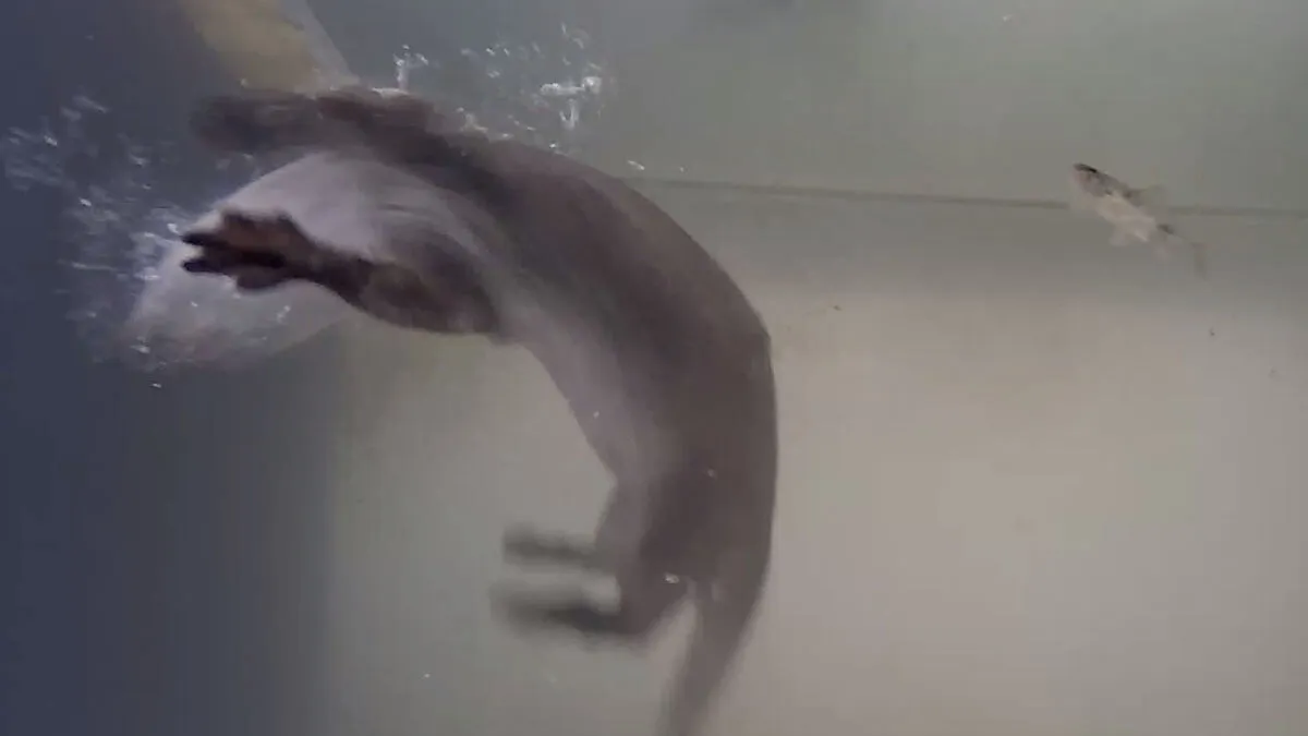 Fischotter schnappt sich vor laufender Kamera einen Fisch