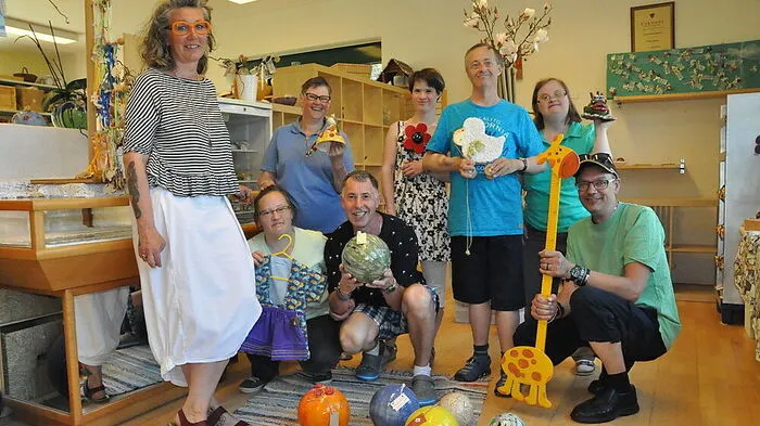 Werkstätten-Leiterin Karin Prettenthaler (links) mit Klienten der Lebenshilfe mit Selbstgebasteltem im Verkaufsraum