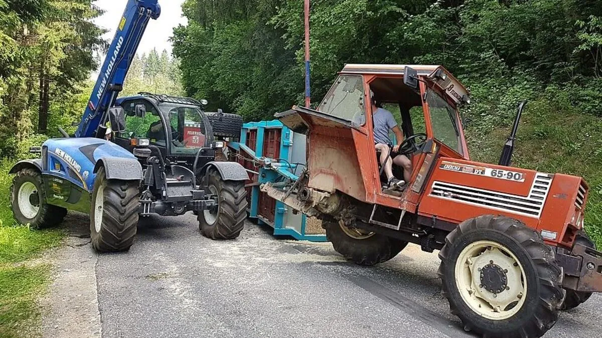 Verkehrsunfall in Lavamünd: Nachdem die Achse der Zugmaschine gebrochen war, löste sich ein Rad des Traktors ab. Das Fahrzeug kam ins Schleudern und der Anhänger kippte um.