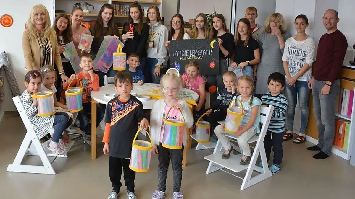 Schüler der HLW Wolfsberg bastelten gemeinsam mit den Kindergarten-Kindern in Reding Laternen. Diese werden beim Laternenfest am 11. November im Garten des Kindergartens ausgeführt.