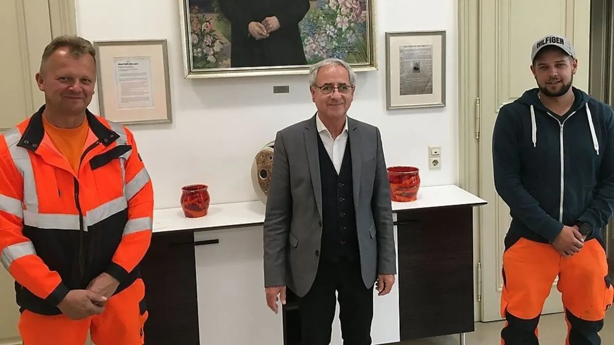 Zwei Gemeindemitarbeiter fanden auf der Straße eine Tasche mit wertvollem Inhalt. Als Finderlohn bekamen sie vom Bürgermeister Einkaufsgutscheine.