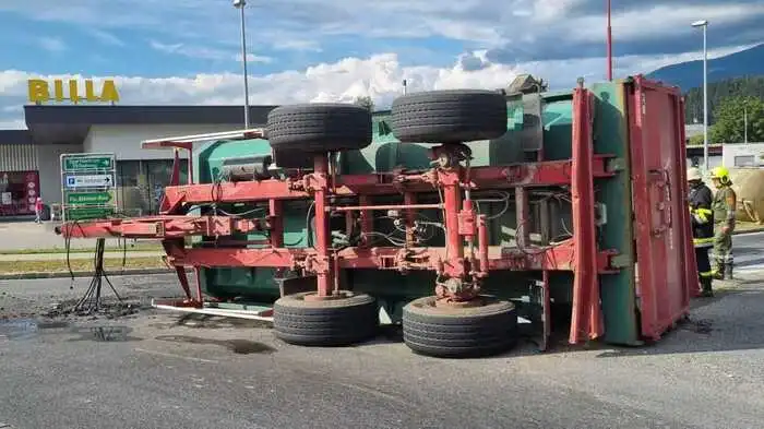 Ein Verkehrsunfall ereignete sich im Lavanttal. Ein Traktor bog in den Kreisverkehr ein. Dabei kippte der Anhänger samt Wassertank um. Rund 15.000 Liter ergossen sich über die St. Pauler Landesstraße.