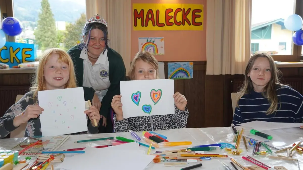 Kinder strahlen und halten ihre Zeichnungen hoch | In der Malecke entstanden kreative Zeichnungen