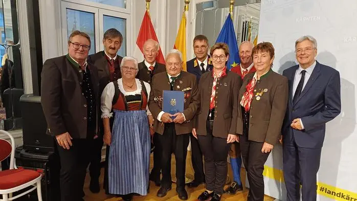 Franz Zraunig erhielt als ehemaliger Obmann-Stellvertreter des Kameradschaftsbunds Rangersdorf von Landeshauptmann Peter Kaiser den Kärntner Lorbeer in Silber überreicht.