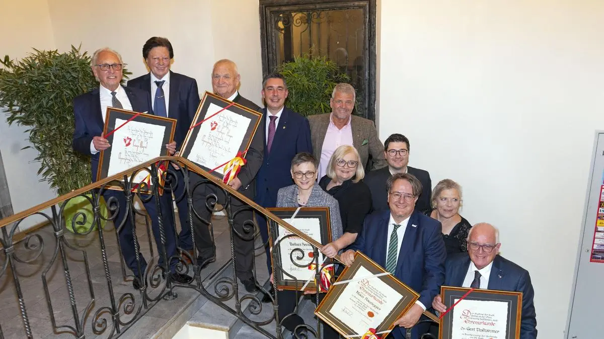 Mehrere Menschen auf einer Treppe, die eine Urkunde halten | Die Ehrenringe und -urkunden wurden im Zuge der Gemeinderatssitzung am Mittwochabend überreicht