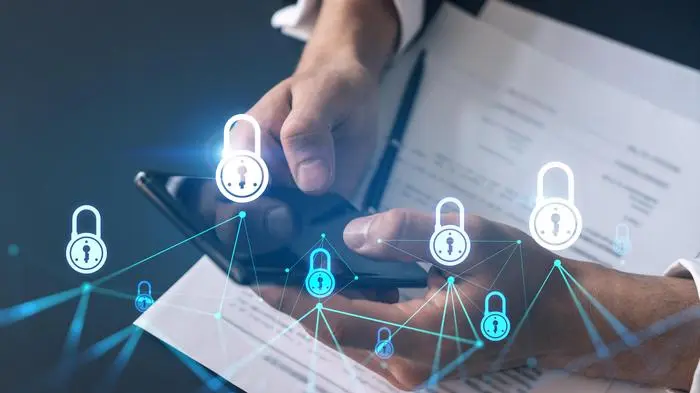 Businessman using on-line app on phone. Lock hologram. Multiexposure. Internet security concept.