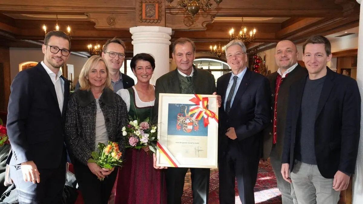Landeshauptmann Peter Kaiser und Landesrat Sebastian Schuschnig überreichten dem Döbriacher Traditionsbetrieb das Landeswappen. Gastfreundschaft wird hier seit über 50 Jahren großgeschrieben.