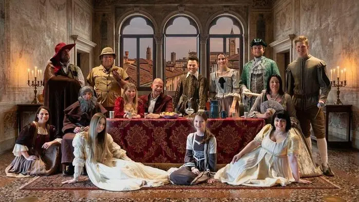14 Personen auf einer Bühne des Mittelalters