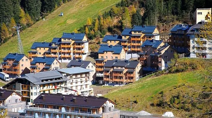 Oberhalb der Gartnerkofelbahn-Talstation: das erweiterte Almhotel (vorne), dahinter die Chalets vom Almressort Nassfeld