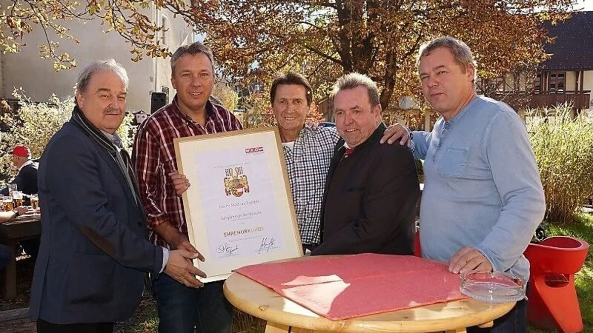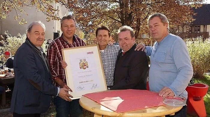 Zum Jubiläum des Schinkenfestes, das jedes Jahr im Herbst zum Gasthof Funder in Lind lockt, schauten zahlreiche Ehrengäste beim Wirt vorbei. Dieser freute sich über eine Ehrenurkunde der Wirtschaftskammer.