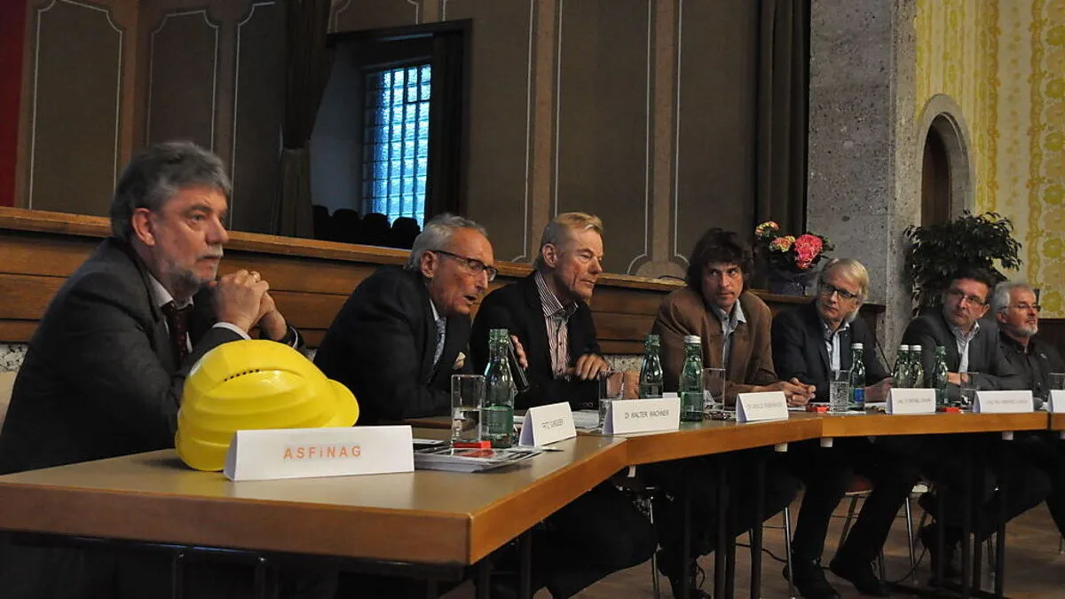 Die Tiroler Fritz Gurgiser und Walter Wachner, Arnold Riebenbauer, die Landtagsabgeordneten Michael Johann und Manfred Ebner sowie Bürgermeister Wolfgang Klinar und Helfried Unger (Bürgerinitiative) diskutierten mit den Bürgern. Der Platz der Asfinag blieb unbesetzt