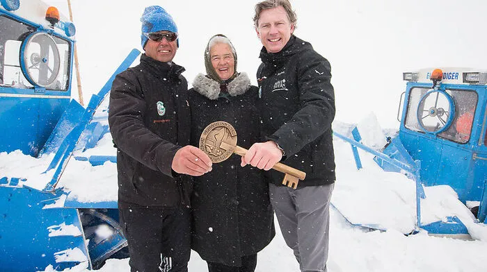 Hoher "Treffpunkt" im Schnee beim Hochtor: Johannes Hörl (Grohag-Vorstand, links) und Peter Embacher mit Frieda Nagl aus Rauris, bekannt als die "Wut-Oma"