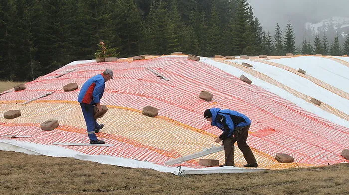 Insgesamt fünf Mitarbeiter der Goldeck Bergbahnen waren mit dem Zudecken des Schneevorrates für die kommende Wintersaison beschäftigt