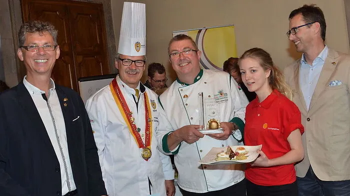 Horst Mitterschaider (Mitte) holte sich 1. Kärntner-Nudel-Award, den Günter und Albin Brunner (außen) ins Leben riefen. HLW-Schülerin Stefanie Fritz half dem Sieger, Günter Walder war Sprecher der Jury