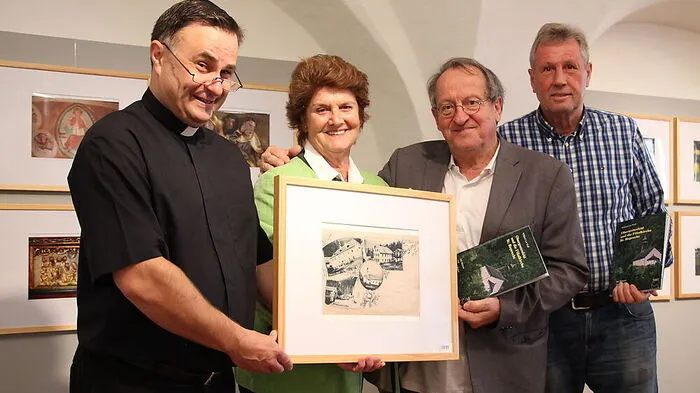 Provisor Jakub Jerzy Radziwonski, Pfarrgemeinderatsobfrau Krista Kulterer, Wilfried Kuß und Bürgermeister Wilfried Pichler begutachten die alten Ansichten und Fotos sowie das druckfrische Buch