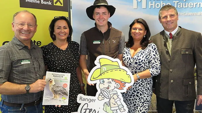 Taufe des neuen NP-Magazins für Kinder: Peter Rupitsch, Maria Tronigger (Raiffeisenbank Oberes Mölltal), NP-Ranger Gerald Lesacher, Manuela Glaser (Kärntner Raiffeisen), Peter Schachner (Raiffeisenbank Mittleres Mölltal)
