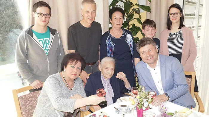 Die Jubilarin Berta Santer zwischen Natalie Baer und Bürgermeister Gerhard Pirih sowie Urenkel Thomas Sixthofer, Enkel Gerhard Kari, Tochter Inge Ivancic, Urenkel Maxi Ivancic und Urenkelin Birgit Sixthofer (hinten von links)
