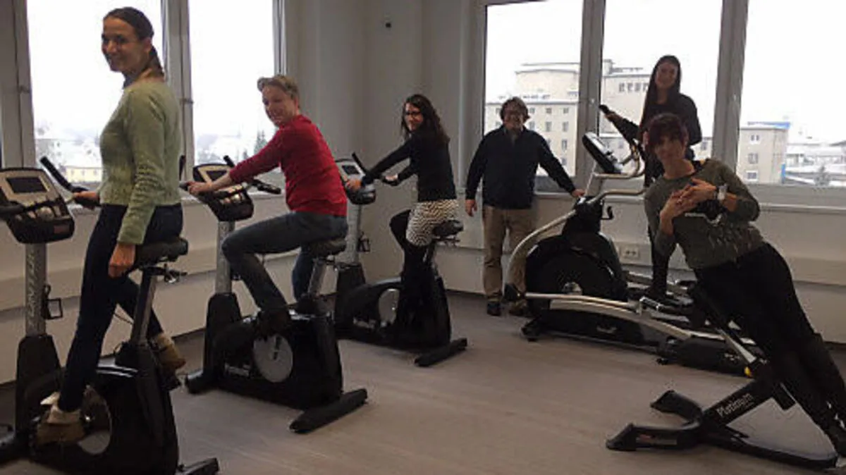 Mitarbeiter der Firma Merck freuen sich über neuen Fitnessraum.