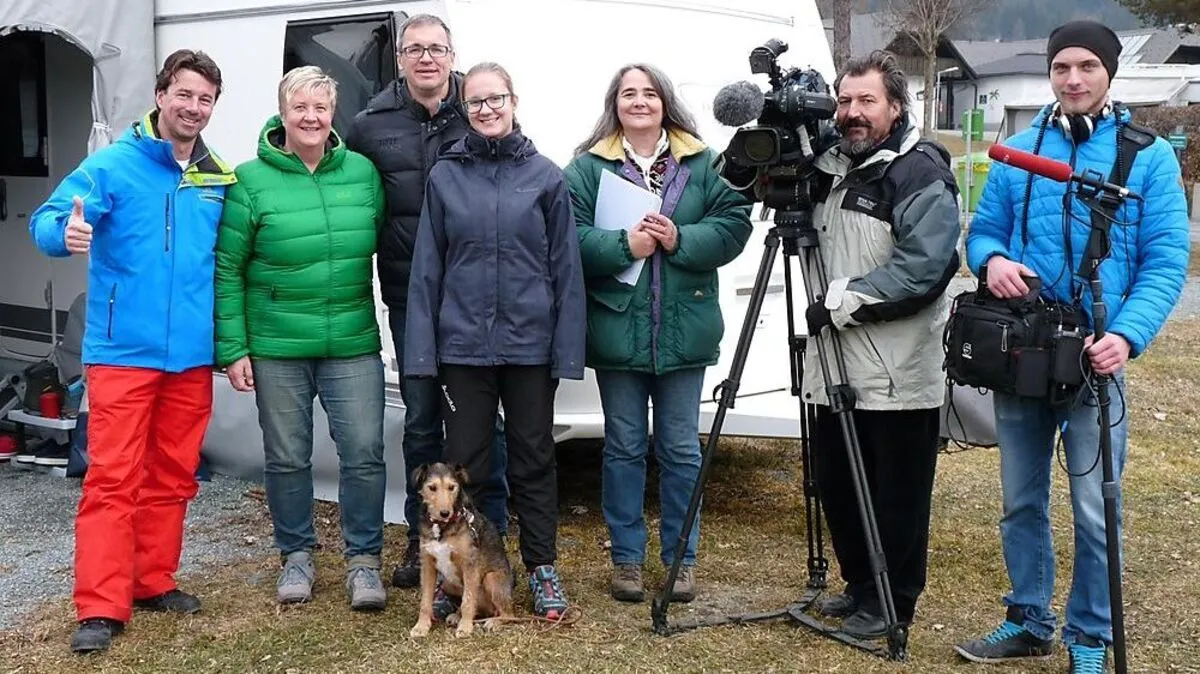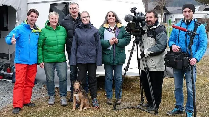 Bei den Dreharbeiten zum Österreich Bild - Wintercamping: Norbert Schluga (Campingplatzbesitzer), Silvia Beckmann, Marco Beckmann, Sina Beckmann mit Hund Foxi (Camper-Familie), Barbara Altersberger (Redakteurin), Ivan Klaric (Kamera), Niko Polzer (Ton)