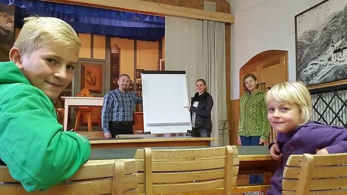 Martin Lugger, Servitenpater Silvio M. Bachorik, Lehrerin Carina Pleßnitzer, Elternvertreterin Helene Lugger und Juliana Lugger im vorübergehenden Klassenzimmer im Servitenkloster in Maria Luggau