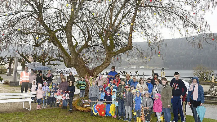 Ein bunt geschmückter Osterbaum, ein Osternest und Hasen aus Holz verbreiten in Millstatt Frühlingsflair.