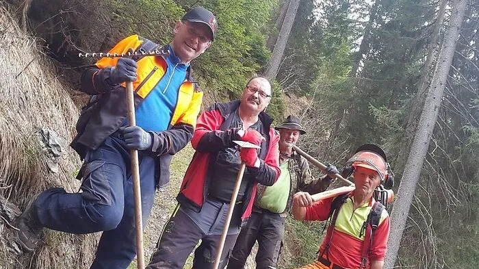 Sie folgten AV-Aufruf: Heinz Mödritscher, Obiltschnig, Harald Stark und Peter Paul Obernosterer helfen bei der Wegsanierung in Lesachtal