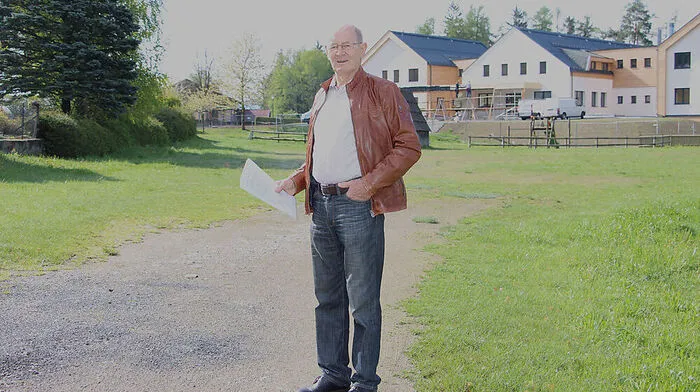 Hofer auf der gemeindeeigenen Wiese vor der Schule, die für Parkzwecke adaptiert werden soll