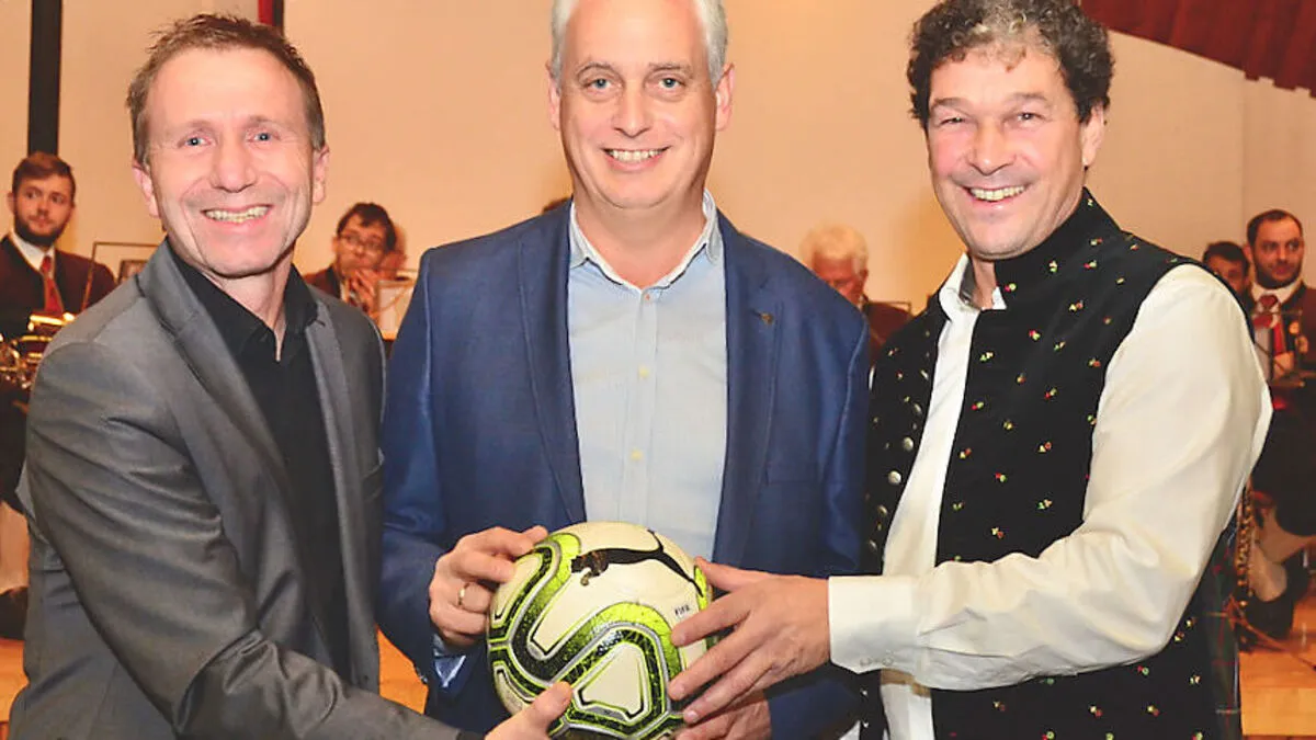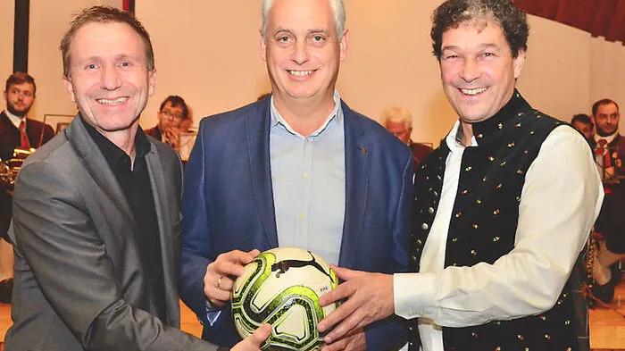 Fußballpräsident Klaus Mitterdorfer mit Bürgermeister Hermann Jantschgi und Vereinsobmann Andreas Brandstätter