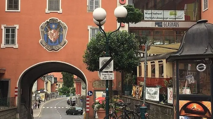 Salomonische Lösung: Das Transparent, welches die Radlobby am Torbogen ohne Bewilligung der BH Spittal angebracht hatte, wurde jetzt an das "Glashaus" weiter gegeben.