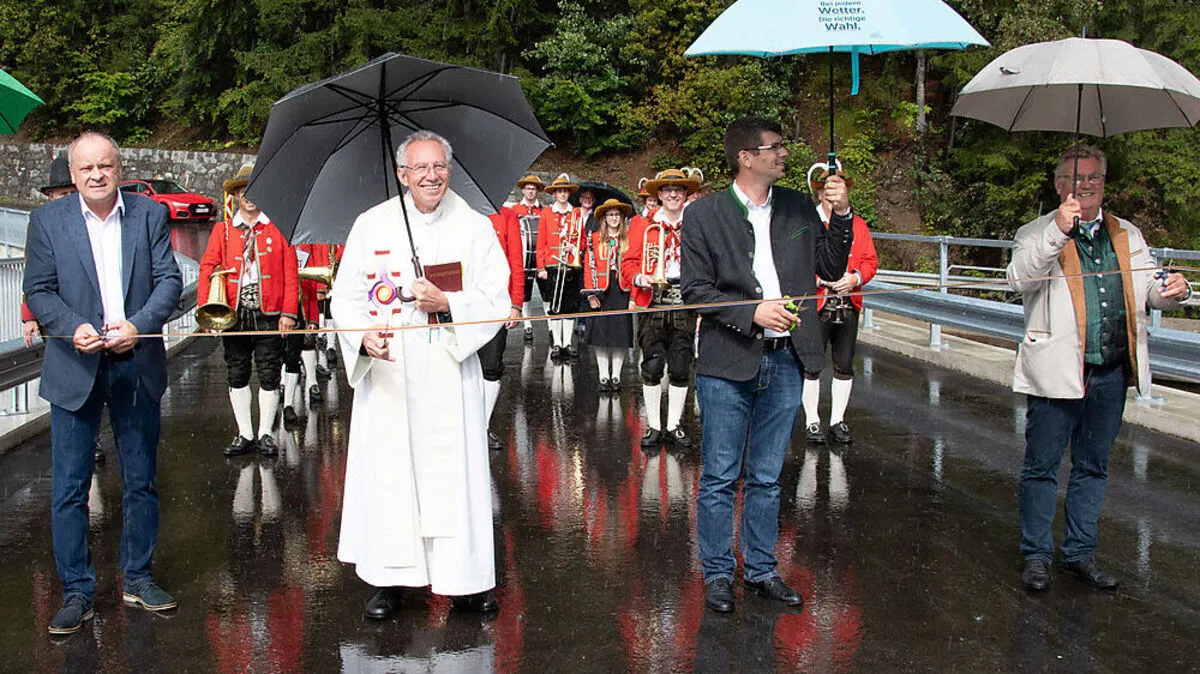 Hubert Amlacher vom Straßenbauamt Villach, Pfarrer Wolfgang Hohenberger, Landesrat Martin Gruber und Bürgermeister Hans Windbichler durchschnitten das Eröffnungsband