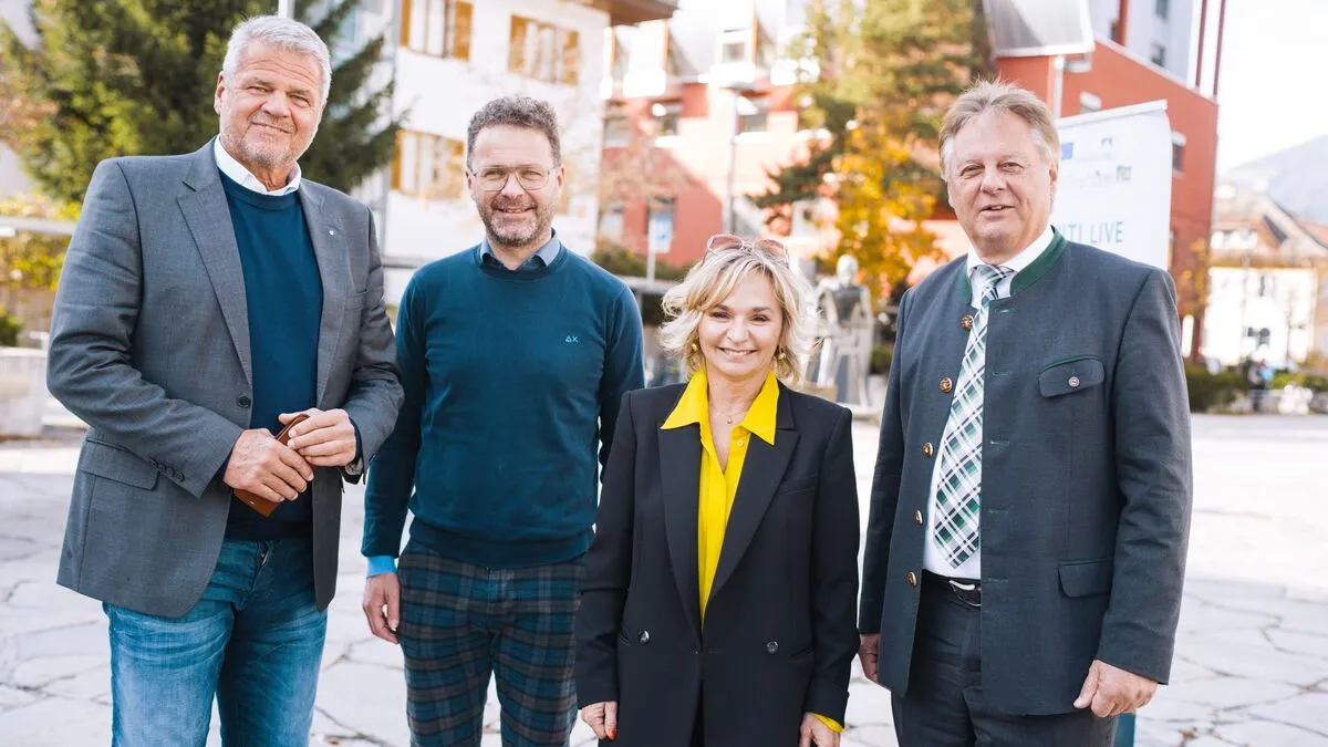Gerhard Köfer, Roland Griessmair, Elisabeth Blanik und Leopold Astner präsentieren den „Süd Alpen Raum“. Nicht alle sind von der Sinnhaftigkeit der präsentierten Visionen überzeugt