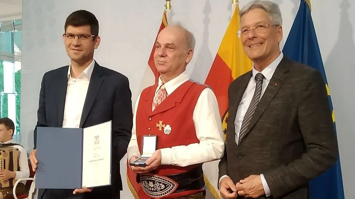 Landeshauptmann Peter Kaiser (SPÖ) überreichte Dietmar Thaler, dem langjährigen Kapellmeister von Rangersdorf, den "Kärntner Lorbeer in Gold". Er spielt auch bei der Gebirgsschützenkapelle.